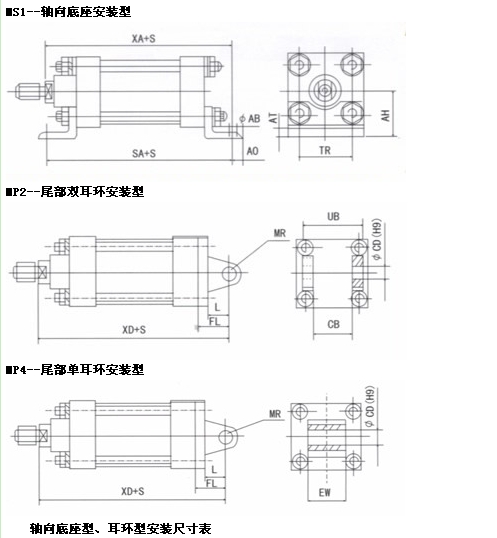 MS1--轴向底座安装型、MP2--尾部双耳环安装型、MP4--尾部单耳环安装型